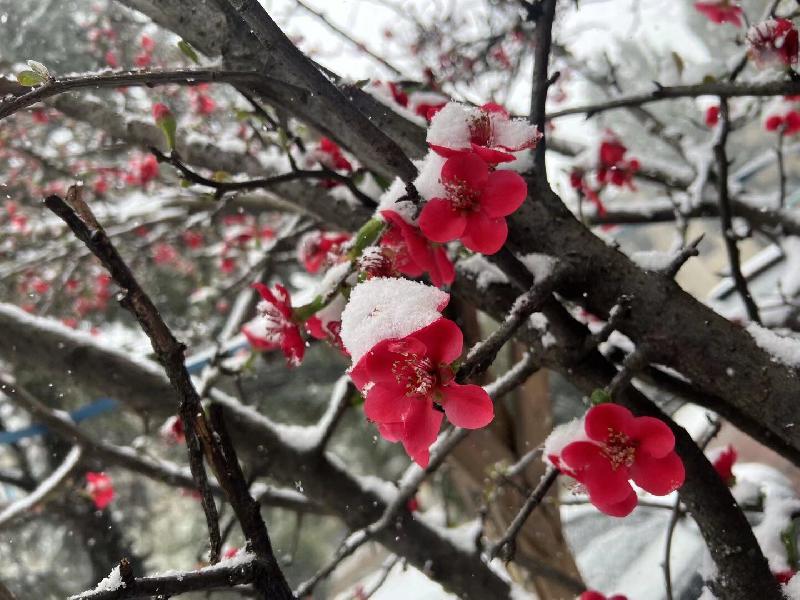 雪,冰封了一切。大院里的木瓜樹(shù)開(kāi)花了,熱情地接受著這冰冷的一切。熱烈的綻放。
