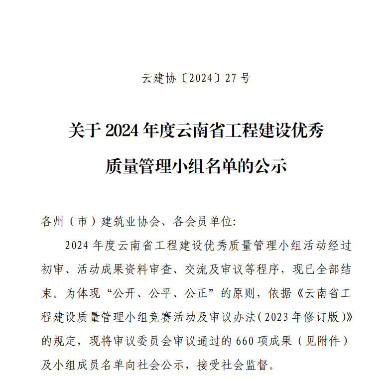 近日,昆明市建筑業(yè)協(xié)會(huì)、云南省建筑業(yè)協(xié)會(huì)及中國(guó)建筑業(yè)協(xié)會(huì)相繼頒發(fā)了2024年度工程建設(shè)質(zhì)量管理小組活動(dòng)成果,公司憑借精細(xì)化的過程質(zhì)量管理和精益求精的品質(zhì)管理,榮獲2024年度中國(guó)建筑業(yè)協(xié)會(huì)工程建設(shè)質(zhì)量管理小組成果二等獎(jiǎng)1項(xiàng)、云南省工程建設(shè)優(yōu)秀質(zhì)量管理小組成果11項(xiàng)、昆明市工程建設(shè)優(yōu)秀質(zhì)量管理小組成果4項(xiàng),獲評(píng)昆明市建筑業(yè)協(xié)會(huì)“質(zhì)量管理優(yōu)秀企業(yè)”榮譽(yù)稱號(hào)。