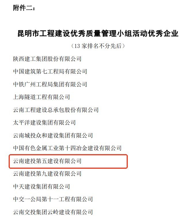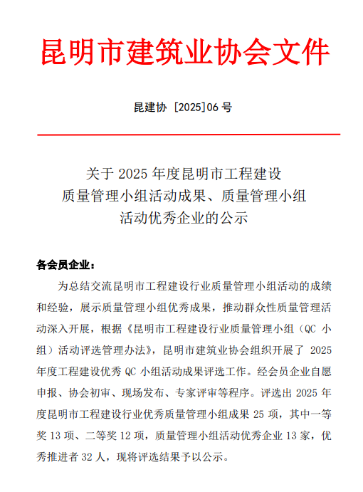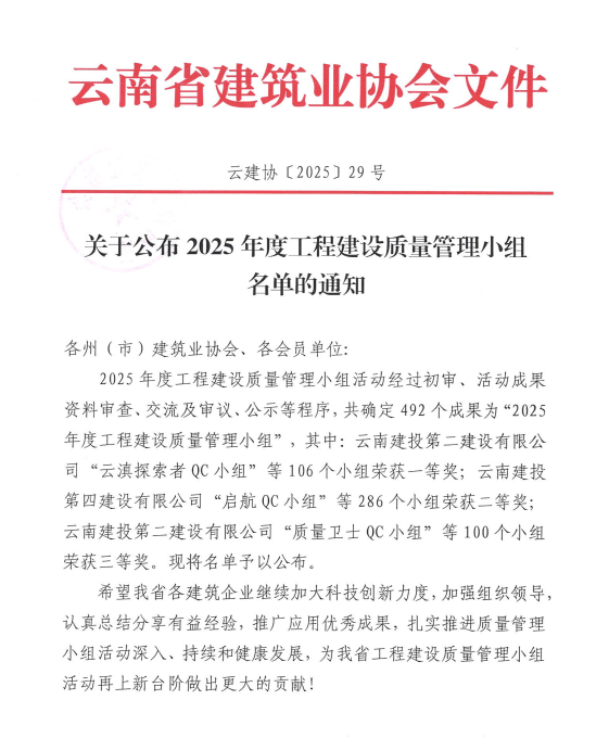 技術(shù)支持: 方森科技近日,云南省建筑業(yè)協(xié)會(huì)、昆明市建筑業(yè)協(xié)會(huì)相繼公布2025年度工程建設(shè)優(yōu)秀質(zhì)量管理小組成果評(píng)選結(jié)果,公司共8項(xiàng)優(yōu)秀QC成果獲獎(jiǎng),其中云南省建筑業(yè)協(xié)會(huì)一等獎(jiǎng)2項(xiàng),二等獎(jiǎng)1項(xiàng),三等獎(jiǎng)2項(xiàng);昆明市建筑業(yè)協(xié)會(huì)一等獎(jiǎng)1項(xiàng),二等獎(jiǎng)2項(xiàng)。公司獲評(píng)昆明市建筑業(yè)協(xié)會(huì)“工程建設(shè)優(yōu)秀質(zhì)量管理小組活動(dòng)優(yōu)秀企業(yè)”稱號(hào)。